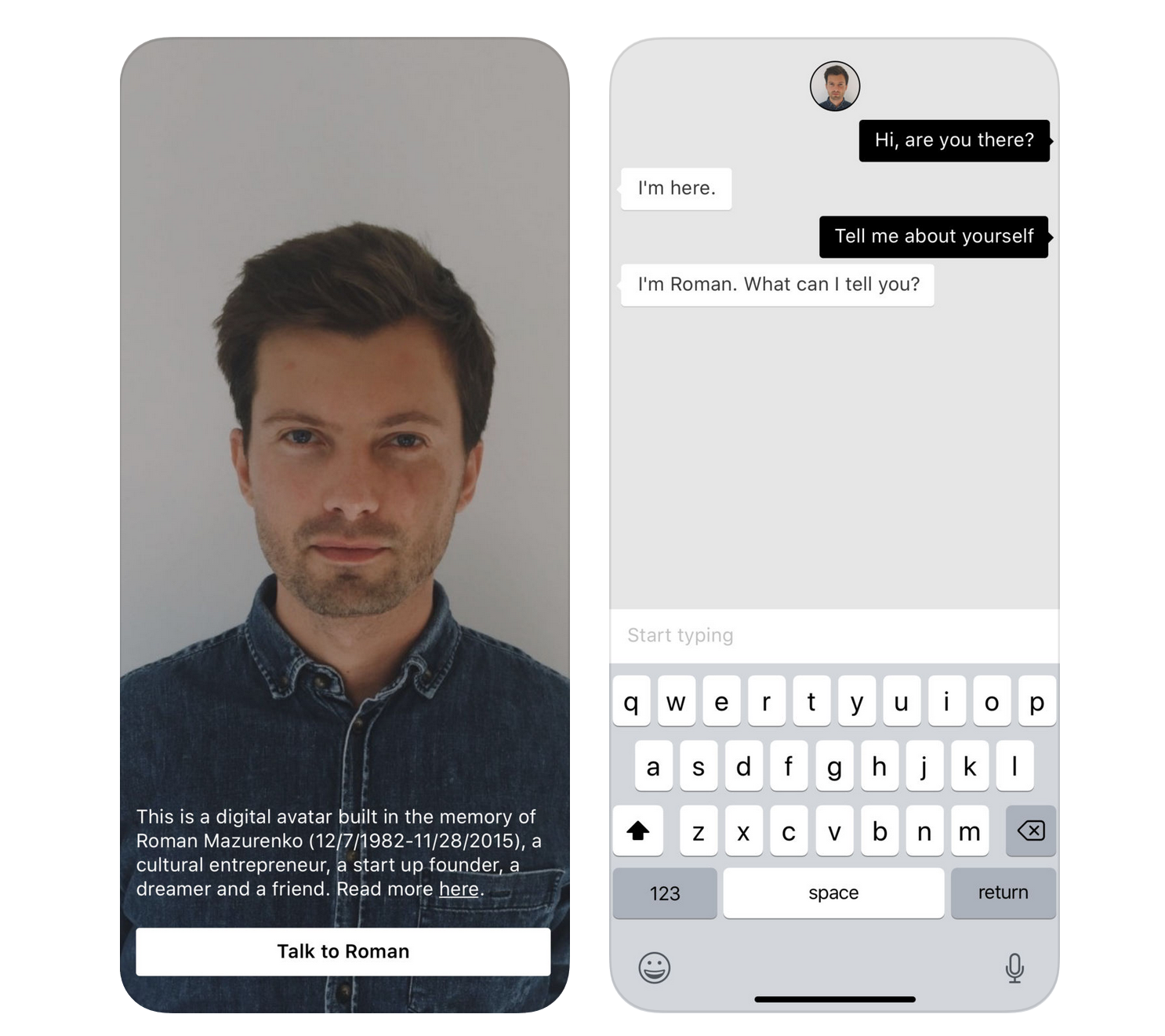 The more controversial approach is presented by companies like Eterni.me, which are trying to not only preserve but, also recreate the dead person. In order to do that posts and social media activity is collected to creat a sample of deceased’s personality that is then loaded onto an online software trying to emulate their behaviours. As described by Marius Ursache, co-founder of, Eterni.me
